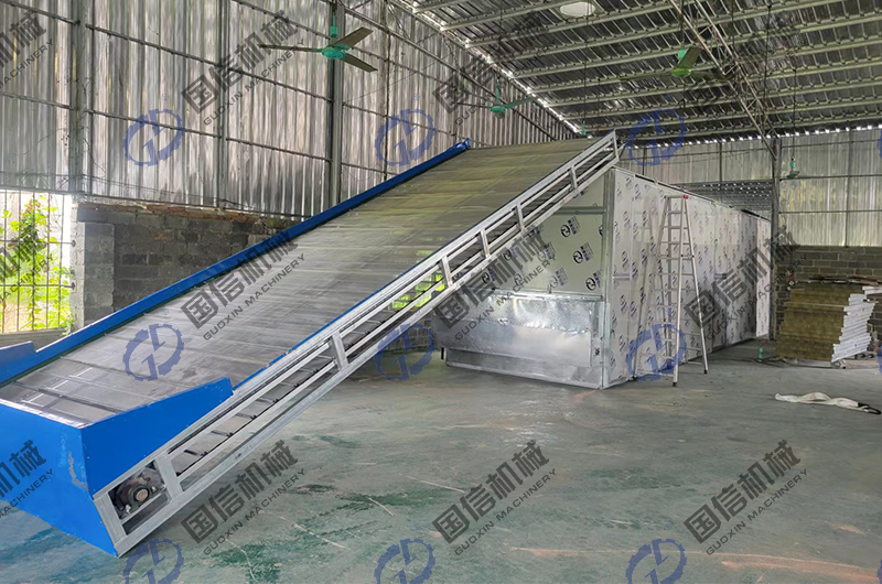 這臺全自動網帶式烘干機,采用的是多層循環翻轉結構,經清洗加工后的中藥材會經過上料輸送機均勻地送入烘干主機內部,會在內部多層不銹鋼網帶的傳送下,循環翻轉,與此同時,熱源提供的熱量,會在引風機的作用下,以熱風的形式進入烘干主機底部,熱風會自下而上的逐層穿過不銹鋼網帶物料層,帶走其中的水分,從烘干主機頂部排出,達到中藥材干燥效果。