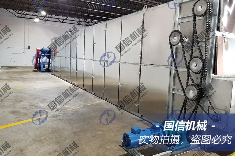 ①佛手片通過上料輸送機進入烘干機主機,通過勻料裝置將佛手片均勻鋪在網(wǎng)帶上。