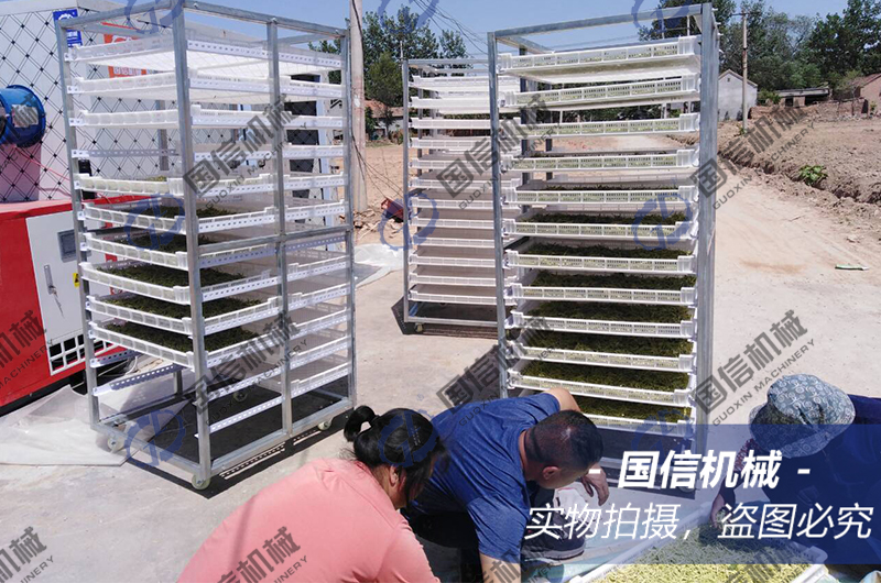 高溫殺青階段 將采摘后的金銀花均勻的平鋪在托盤(pán)上,可以用噴淋裝置對(duì)金銀花噴灑少量的水,然后放置于小推車(chē)送入烘干房,設(shè)置溫度65~70℃,待溫度穩(wěn)定后,時(shí)間保持1.5~2小時(shí)即可完成殺青階段,此階段是金銀花烘干工藝的重要階段,決定了成品干貨的色澤。