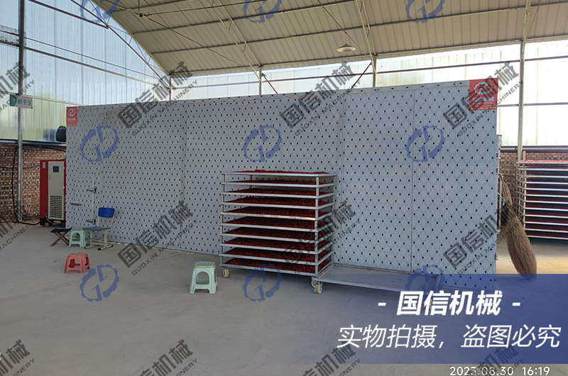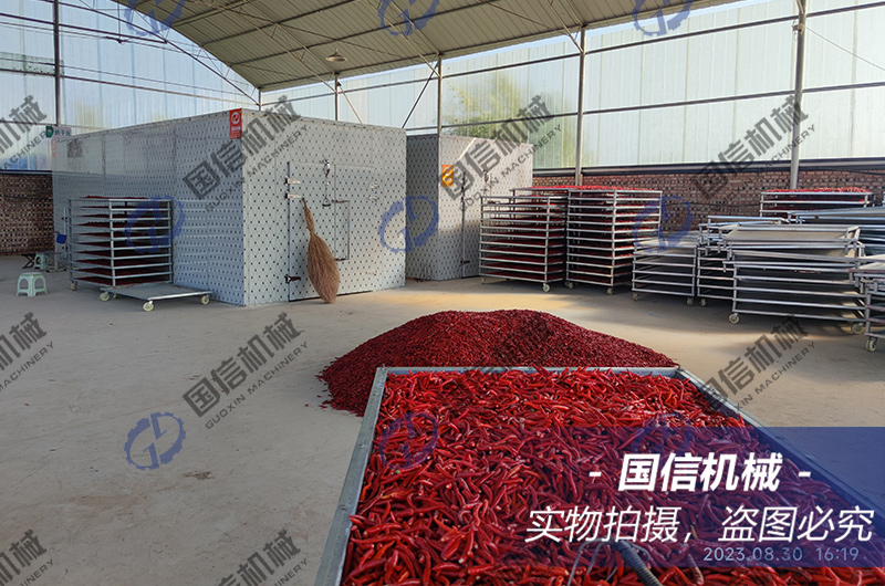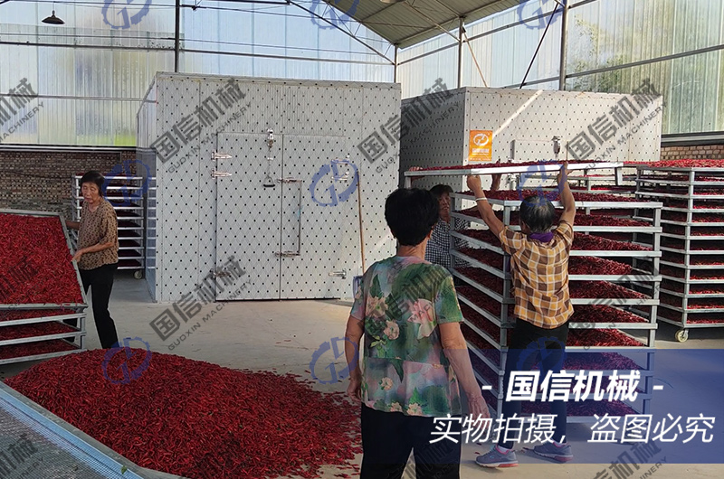 辣椒送入烘干房內(nèi)迅速升溫至50℃左右,使辣椒快速接觸到熱風(fēng)發(fā)汽,加強(qiáng)排濕,保證顏色品質(zhì),不給辣椒熟化轉(zhuǎn)變時(shí)間,至辣椒表面干燥縮水,濕度控制在50%左右,時(shí)間保持在10-20個(gè)小時(shí)。