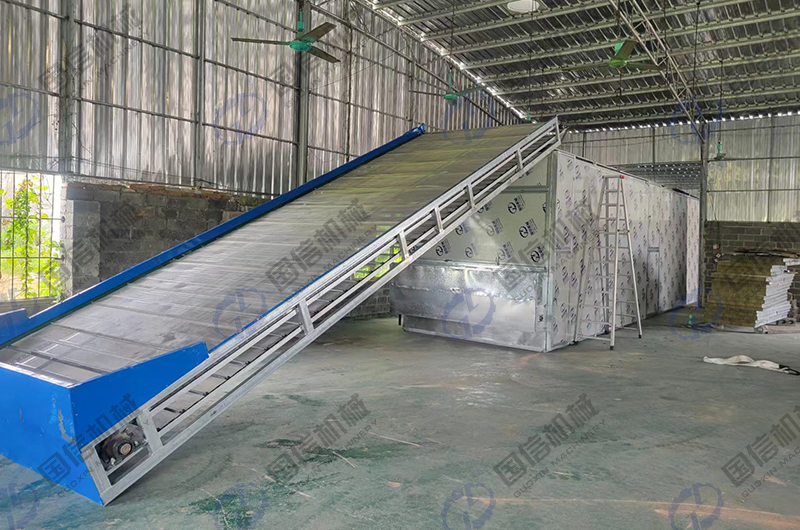 網(wǎng)帶式木瓜絲烘干機(jī)主要由烘干箱體、熱交換爐、輸送裝置、均料裝置、保溫裝置、熱風(fēng)輸入裝置、電控溫控裝置等構(gòu)成。與物料的接觸件為純不銹鋼材質(zhì),全套設(shè)備運(yùn)行可靠,沒(méi)有易損件。經(jīng)過(guò)處理后的木瓜絲由輸送帶送到頂部上層網(wǎng)帶上,木瓜絲隨網(wǎng)帶呈“S”形從上層往下層移動(dòng),熱氣流自下而上穿過(guò)網(wǎng)帶及其上的物料層,多層循環(huán)翻轉(zhuǎn),逐層烘干,直至烘干完成,烘干后的木瓜絲從底層的出料口排出。在落料過(guò)程中,物料受熱面改變,保證干燥的均勻性。